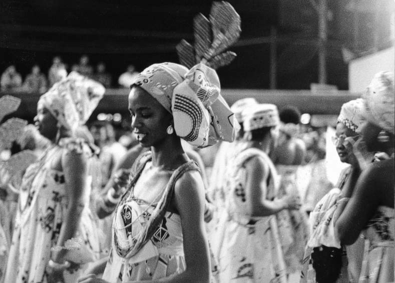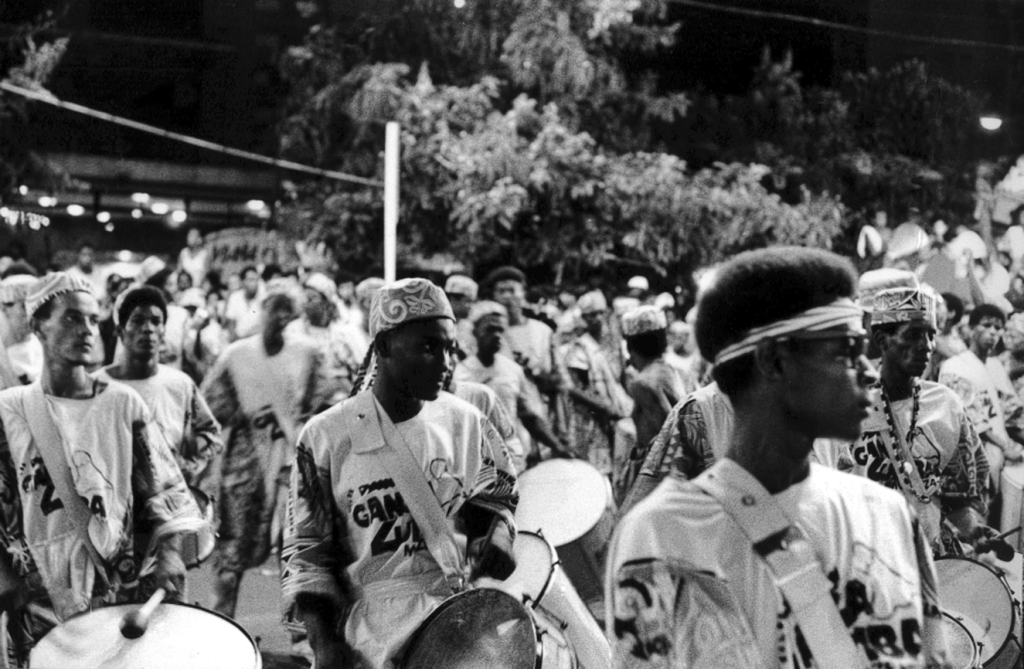 Ao longo do dia víamos gente pelas ruas com roupa do Apaches, do Ara Ketu, do Gandhy. Waldir chegou. As duas em ponto, como combinado. Com uma roupa do… Ilê Aiyê. Waldir, cadê a roupa do Gandhy??? Encontrei um brother no caminho e troquei com ele, aí eu saio no Ilê mais tarde. Agi rápido. Parei um cara na rua, aluguei sua roupa do Gandhy por algumas horas, reuni mais uns cinco ou seis foliões que estavam de turbante azul e branco e foi assim que o Waldir apareceu no filme, em closes e planos fechados inseridos depois na montagem esperta do Sergio Mekler.