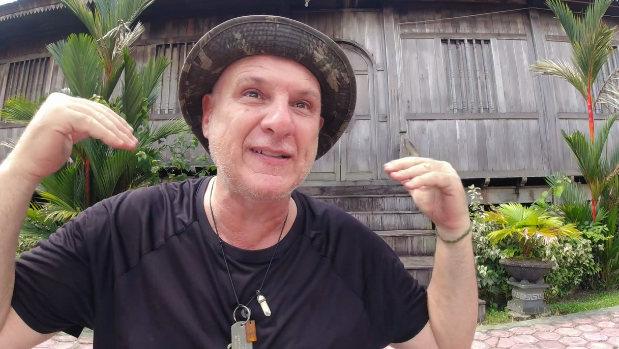 A minha conversa com Toco para a Corda começou no final de maio deste ano. Portanto, em maio, eu perguntei pra ele: Onde você está agora? Eu estou em Kalimantan, na selva de Borneu, na parte indonésia, na casa do último sultão, que caiu em 1949. A casa aí do fundo era a casa do sultão.