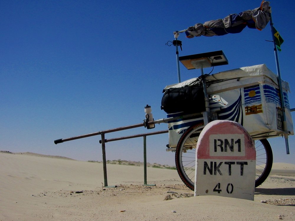 Mais fácil que cruzar a Av.Brasil na hora do rush (qualquer Av.Brasil, a do Rio e a de Sp) Depois eu fiz uma volta ao mundo com o Amyr Klink, eu fui o cinegrafista desta história. E quando eu fiz 40 anos, como eu ia mesmo ter a crise dos 40 anos, eu resolvi fazer a viagem dos 40 aos 50 logo, resolver as duas crises ao mesmo tempo. Abri um mapa da África, vi a capital da Mauritânia, Nuaquexote, nunca tinha ido pra lá, era um país que ainda tinha nômades cruzando o deserto, e do outro lado está Tunís e o Mediterrâneo e aí nasceu, não foi sonho, não foi nada, eu olhei e falei, eu vou fazer esta viagem! Minhas viagens não nascem de sonhos. Este negócio de sonho não rola muito comigo não. Eu sinto, eu tenho o instinto e falo, eu vou atravessar isto a pé! E aí eu começo a pirar, a pesquisar a melhor forma de fazer o percurso. Nesta viagem eu resolvi ir puxando uma espécie de charrete. Eu construí um riquixá. E comecei uma viagem super maluca, porque são seis mil quilômetros cara! Isto em 2005. Fui pelo Cabo Verde, pelo Senegal, consegui o visto, coloquei todas as tralhas num carro funerário, um trampo fodido. Mas quando eu entrei na Mauritânia, me veio uma sensação de bem estar e eu falei: UAU! Este lugar é a minha casa! Ou a minha segunda casa, ou já foi a minha casa, sei lá.