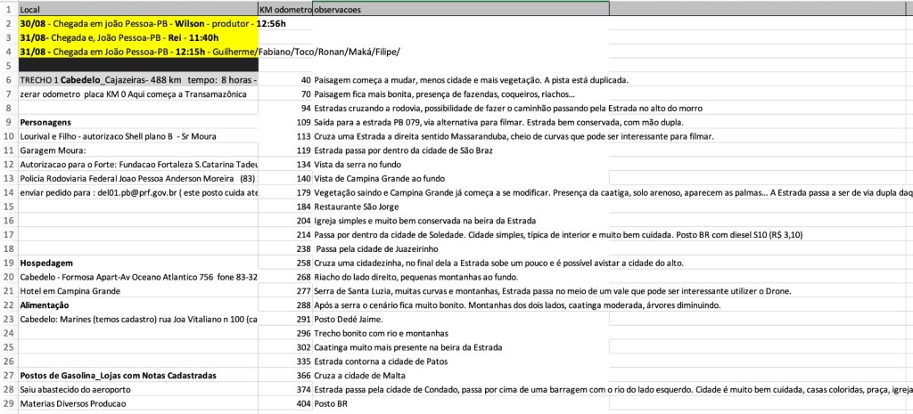 Quando fizemos o Transamazônica, eu fiquei impressionado com o mapeamento que você fez da estrada. (vale explicar aqui: ao longo de toda a estrada a gente lia que no km x havia um ótimo lugar pra comer peixe, que no km y a gente ia gastar 1 dia pra percorrer 100 km porque a estrada está uma merda, que no km z tem a tia Nenê que faz uma comidinha bacana..) Durante uns 5 ou 6 anos eu gravei o Rali dos Sertões pro AXN, e no rali as equipes recebem as planilhas, as rotas do dia a dia, e quando o João Roni me chamou pra fazer a Transamazônica eu falei pra ele, eu não posso mais ser cinegrafista, eu ando perdendo o foco…pra que mais tem vaga? Produtor de campo, ele respondeu. Porra me dá isso aí, eu quero. Então eu fui com o Guilherme Valiengo, (que foi o assistente de direção da série) fazer o mapeamento da estrada inteira. Eu ficava no odômetro e o Gui ia escrevendo. Saída de Cabedelo do posto X, zera o odômetro. Km 05, lugar legal, posto de gasolina, a gente ia pontuando as coisas legais que tinha pelo caminho, onde tinha hotel, etc. E cada cidade que a gente saía a gente zerava o odômetro e assim foi durante quatro mil e duzentos km até Lábrea. De noite eu passava tudo isto pra uma planilha de excel. Quando você e o Jorge vieram pra gravar, a gente já tinha tudo aquilo mastigado. Eu acho que no final eu rodei uns 15 mil km de Transamazônica, porque foram duas viagens completas. E o planilhamento ajudou.