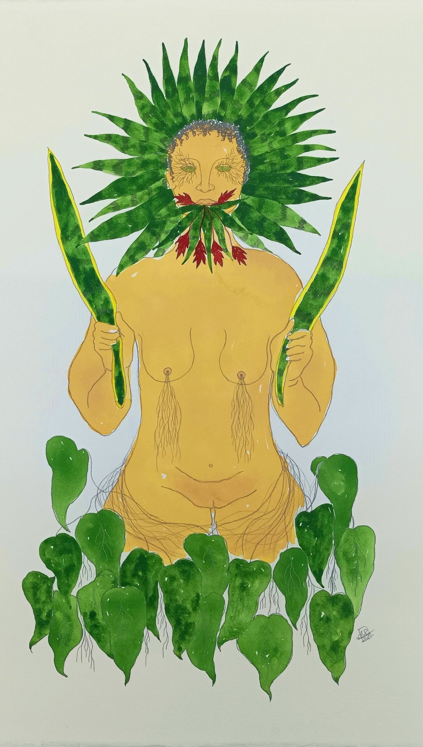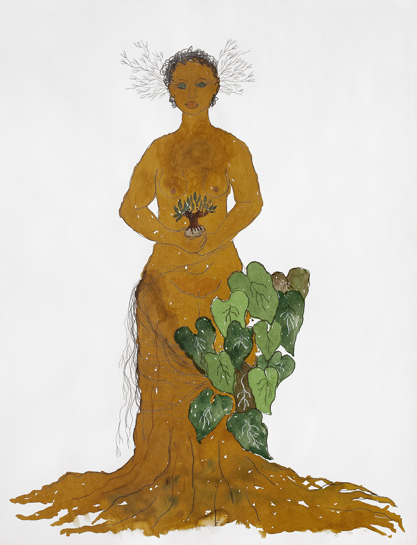 RP: Depois de fazer as Jatobás, me veio a ideia de fazer estas mulheres mangues, e continuar pensando num arquétipo para as mulheres negras no Brasil e eu começo fazendo essa ideia de integração com a natureza. Quando a gente fala de mulheres negras no Brasil, e da subjetividade destas mulheres, a psicologia não dá conta. A psicologia do Ocidente não dá conta. A gente vai sempre pensar na mitologia grega, nas Vênus, nas Heras, em Atena, todo aquele panteão grego. Mas será que isto dá conta das mulheres brasileiras, e principalmente, das mulheres negras? Acho que não. As mulheres negras sempre tiveram a sua subjetividade negada. Seu lado psicológico nunca foi olhado com atenção. Obviamente a gente tem possibilidades de existência que são muito diferentes daquelas que tem na Europa, por exemplo. Estou pensando nesse feminino negro dentro de condições da natureza brasileira. A ideia vem de antes e é pensar algo que caiba para as mulheres negras, não do ponto de vista do “selvagem”, como foi sempre colocado, mas do ponto de vista da vida, da generosidade e, arrisco dizer, de conhecimentos que podem salvar a espécie humana diante das mudanças climáticas.