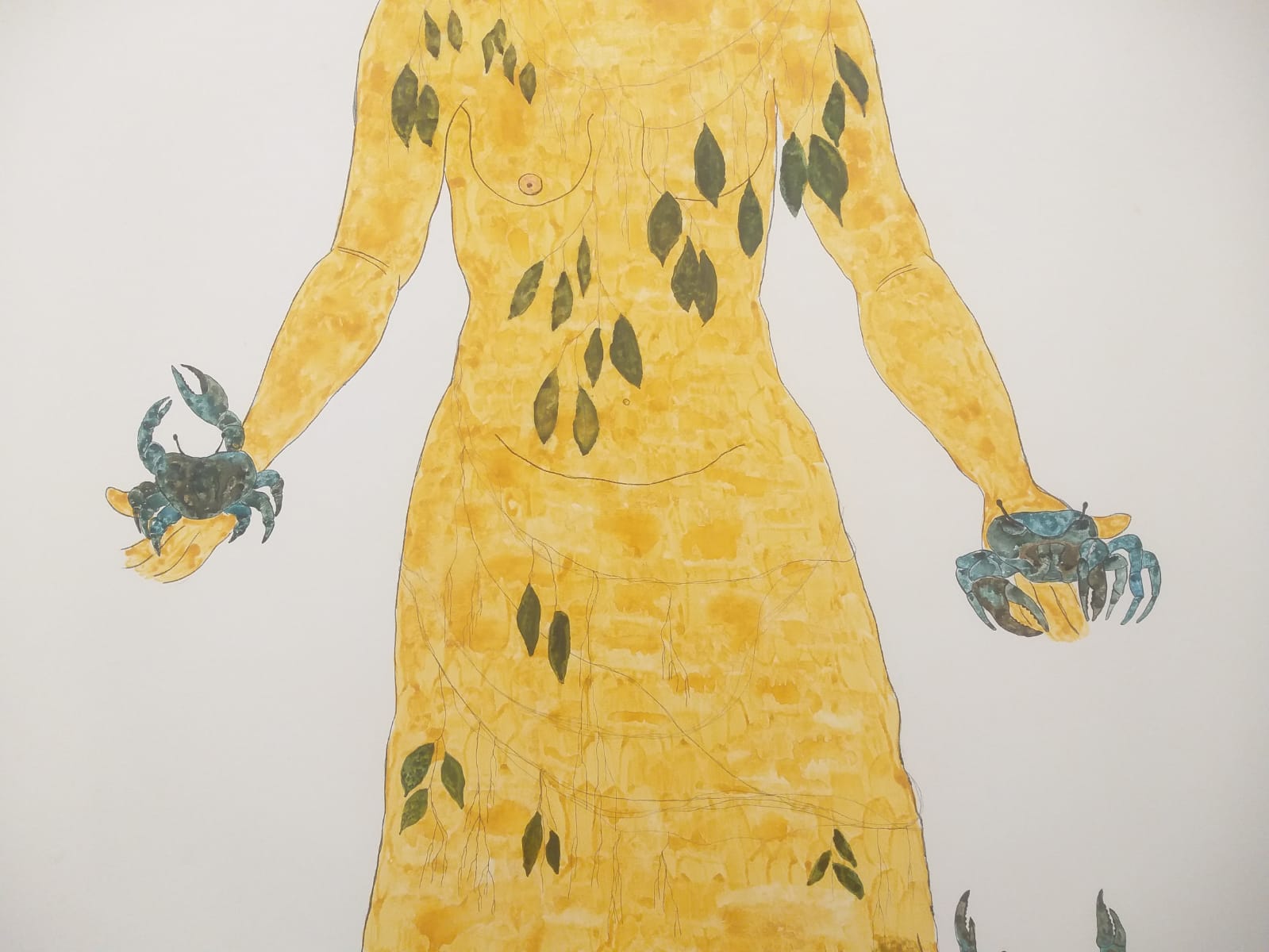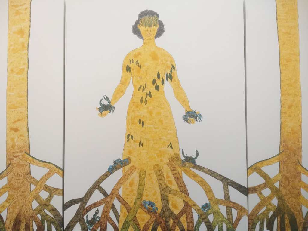 RP: No Ocidente a mulher que quer ter liberdade, ela é a bruxa ou ela é a louca, ou é a prostituta, ou então, quase que como uma punição, ela vai ser a eterna virgem, como Atena. E as mulheres negras elas tem outras possibilidades, como Iansã. Que é força, que é poder, que é beleza, mas ao mesmo tempo é mãe e tem sexualidade. Então eu fui procurar estes arquétipos: as senhoras das plantas, a búfula, que é uma referência direta à Iansã, as jatobás e agora, as mangues. As mangues são atemporais, eu não consigo pensar numa idade.Eu tenho uma amiga que fala que as mangues são as avós, das avós das jatobás. São energias femininas muito, muito primordiais, a gente vê ali energias de generosidade, como a peixe, de mistério, do oculto, do desconhecido,como é a caranguejo, a gente vê a jovialidade da guará-vermelho e os mistérios todos contidos naquela grande mãe que á garça branca. Então as raízes do mangue se interconectam entre si. Eu sou fascinada pelas raízes do mangue. Pensar as manguis, pensar estas várias facetas das mulheres negras que estão ali, atemporais, procurar talvez, novas subjetividades, pensar nos arquétipos que nos cabem. Eu acho que isto é um pouco do que são as mangues que estão na Bienal.