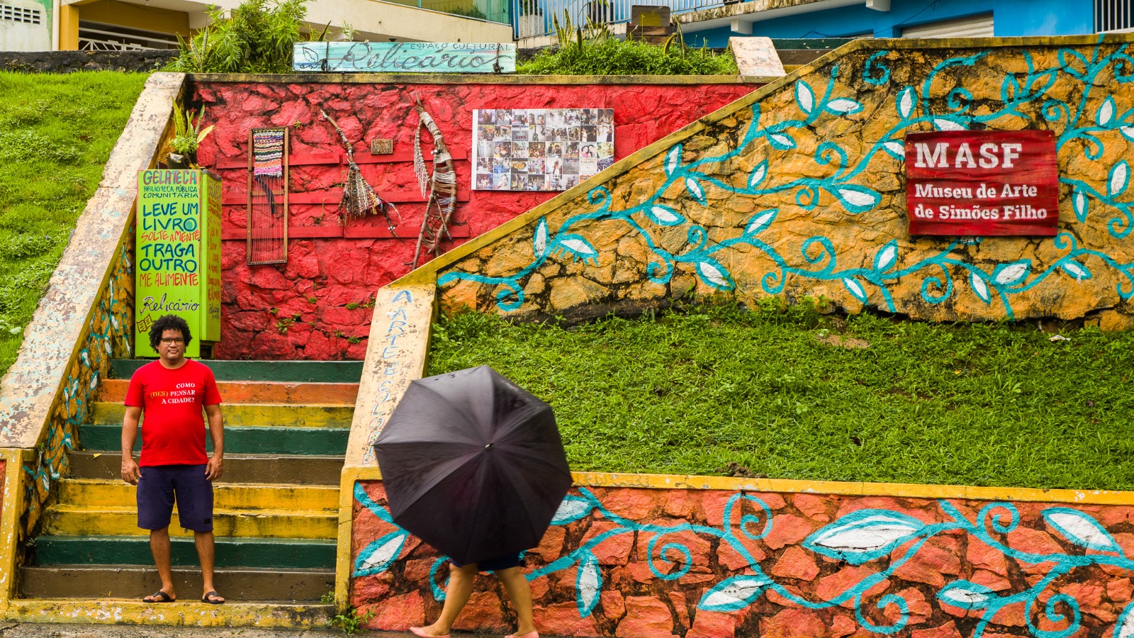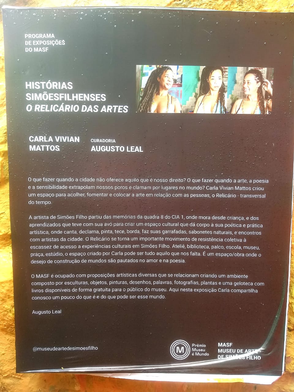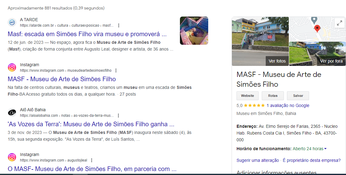Em junho de 2023 Augusto comandou a criação de sua obra mais subversiva: o MASF. Museu de Arte de Simões Filho. O Museu funciona numa escadaria próximo de sua casa. Ela foi pintada e seus muros servem como galeria, onde artistas locais podem expor seus trabalhos. Inspirado na programação de seu primo rico que mora perto da FIESP, o MASF inaugurou com uma proposta conceitual bem amarrada: contar as histórias simõesfilhenses. O MASF transforma um lugar de passagem e transitório em ponto de referência. Procure no gugoolll… As exposições também seguem as normas do mercado: curadoria, assessoria de imprensa, divulgação e vernissagem com comes e bebes. E como esta noite se improvisa, se precisar de banheiro tem a padaria do outro lado da rua, o café expresso da recém inaugurada Cacau Show e a tapioca da barraca do Júnior.