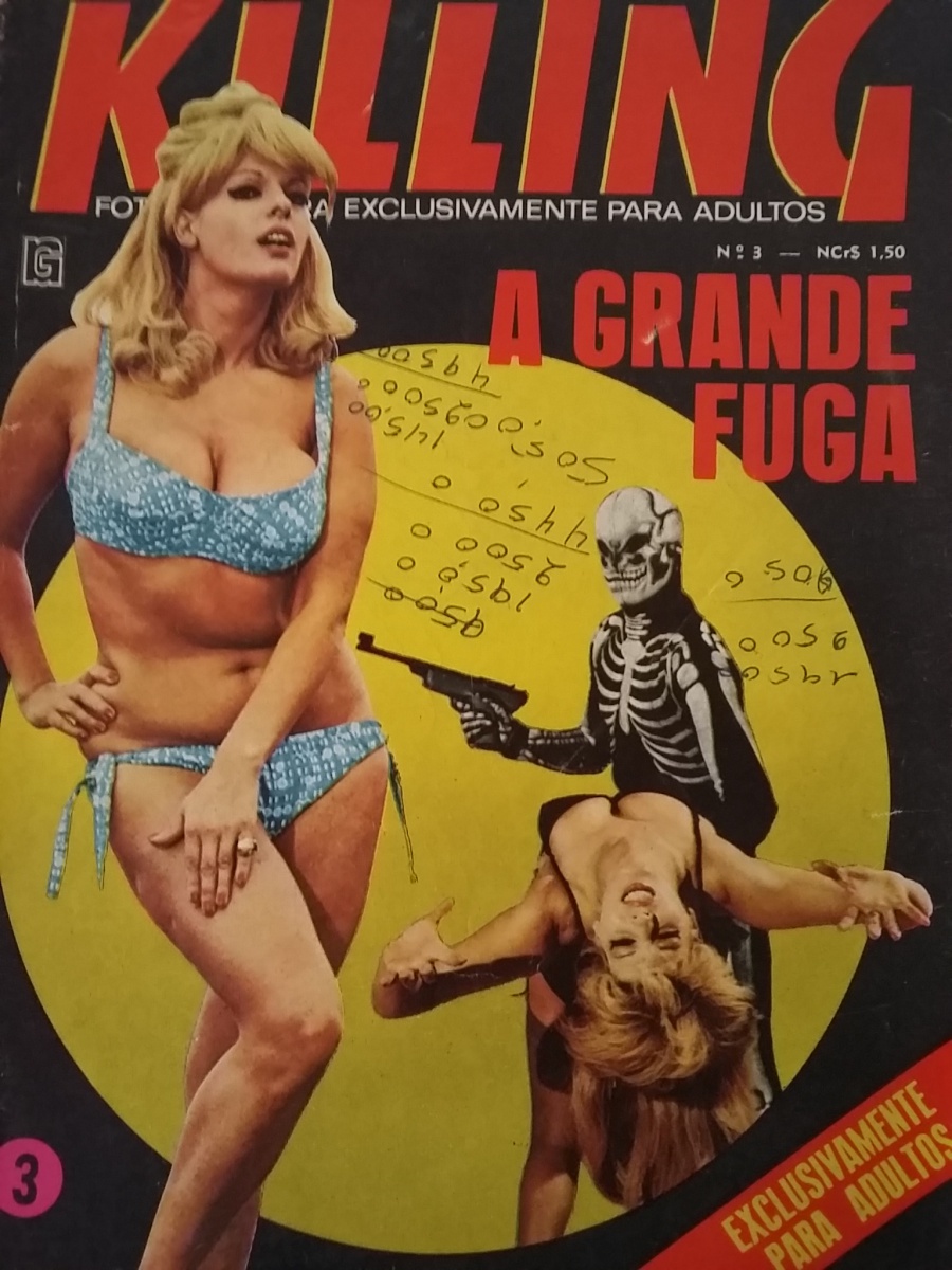 A cenoura na sua vida ou na do Mário Gomes? Deixa pra lá…Você lia fotonovela? Eu lia a das empregadas e roubava os pôsters…a Nádia Lippi, a Sandra Barsotti, Silvia Bandeira, Monique Lafont.. Eu era realmente apaixonado por fotonovela. Lia as fotonovelas românticas. Em casa não tinha mas…as beiradas né? Eu tinha uma tia, irmã do meu pai que lia, aquelas fotonovelas italianas e tinha uma série de fotonovelas masculinas com agentes secretos e tinha uma que era super perversa, chamada Killing, um cara que aparecia sempre com uma roupa de caveira e era mestre dos disfarces, ele era bandido, era totalmente amoral, torturava mulheres…um negócio…eu tenho alguns exemplares…