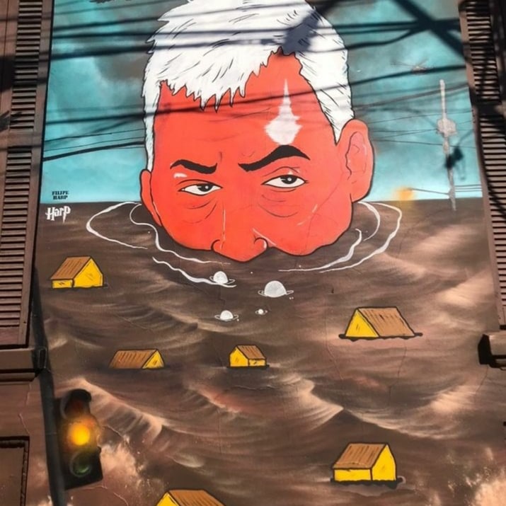 O prefeito de Porto Alegre, o Véio Véio, da ala centrãodireita viamoinhosdevento, bolsonomeubolso do mdb, não gostou do que viu no espelho, ficou magoadinho e mandou apagar o grafiti de Filipi Hart, onde ele foi retratado em toda a sua plenitude lamacenta. Apagado o muro, Filipi mandou brasa e repetiu a obra na fachada do espaço cultural Casaverso. Chinelo ficou magoadinho novamente, entrou na justiça e uma justicieraeleitorera mandou apagar. Chimelo é tão chinelo, que num primeiro momento, negou que tinha mandado apagar o retrato. Apareceram fotografias do segundo apagamento. Funcionário de uma empresa terceirizada sem licitação praprestarservicio pra prefeitura. A rapaziada local que não tem merda na cabeça reagiu e espalhou cartazes: