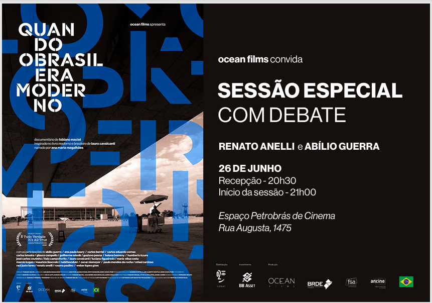 Quando o Brasil era Moderno, estreia agora, dia 26 de junho, as 20.30 em São Paulo, no Espaço Petrobras de Cinema, na rua Augusta 1475. Depois da sessão, debate com os arquitetos Renato Anelli e Abílio Guerra.