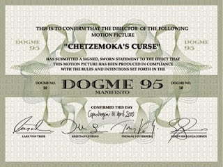 Em 1995 dois cineastas dinamarqueses, Lars von Trier e Thomas Vinterberg lançaram um manifesto onde colocavam uma série de regras, limites e normas técnicas para se fazer um filme. Algumas regras que eles propunham: sempre filmar em locação, jamais em estúdio; usar sempre som direto, música só se ela estiver realmente tocando, num rádio ligado ou num toca-discos girando em cena. Trilha sonora original era proibido, assim como também era usar luz artificial e colocar a câmera no tripé. Efeitos especiais levavam cartão vermelho antes mesmo de serem cogitados.