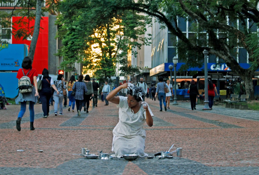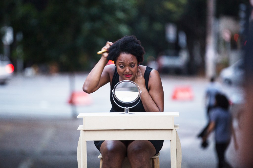 Exatamente porque os corpos negros na nossa sociedade, eles não têm essa liberdade, esse lugar de sentir essa raiva. O que eu acho muito cruel, porque são corpos que são submetidos à violência constante. Então eu acho um tanto cruel, você submeter esse corpo constantemente a um processo de violência e ainda esperar que esse corpo esteja passivo o tempo todo e que não tenha nenhuma reação. Como que a gente não vai reagir, como que a gente não vai ter raiva diante de tanta violência e de tanta brutalidade? E para corpos negros, principalmente, é muito difícil, porque já somos acusados de sermos raivosos, incivilizados, violentos, selvagens, então a gente ainda não têm esse direito de ter essa reação, porque se a gente reage de forma raivosa, é um outro problema, uma outra culpabilização. E eu encontrei na performance esse lugar, o lugar onde eu posso transmutar essa raiva e colocar essa raiva de alguma forma, muitas vezes em imagens, às vezes em palavras. É incômodo porque as coisas que eu vivo são incômodas.
