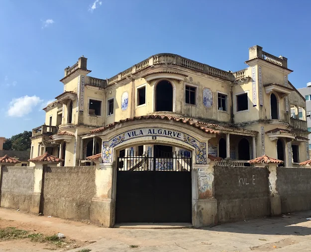 Pouco antes de chegar no Hotel Terminus em Maputo, vejo pela janela do carro um palacete abandonado, com muitos azulejos portugueses na fachada, inclusive no painel que lhe dá nome: Vila Algarve. Alcídio, diretor do INICC (Instituto Nacional das Indústrias Culturais e Criativas de Moçambique) percebe minha curiosidade: Esta casa é assombrada. Espíritos estão a viver aí por dentro. Pensei comigo, já é tarde, amanhã venho fotografar e, se tiver sorte, encontro algum espírito. Faço o check-in e da janela do quarto tenho os fundos da Vila. Escombros, mato escapando pelas janelas vazias e corvos. Muitos corvos. Por precaução, fecho as cortinas e desço pro bar, numa agradável varanda de frente pra rua cheia de jacarandás. Aqui não servimos bebidas com álcool. Espíritos só no bar dos fundos, na piscina. Cruzo pela explicação ao ver duas portas no caminho: espaço para oração homens/ espaço para oração mulheres. Rezo agradecendo a Guinness gelada que está na minha frente e aproveito pra divagar: um palacete em estilo neocolonial português construído no auge do estilo neocolonial (anos 30) num país que naquele momento ainda era colônia de Portugal, pode ser considerado como neocolonial? Ou é um palacete colonial? Ou seria um palacete colonial em estilo neocolonial? A Ana Paula Koury vai puxar minhas orelhas se eu começar a raciocinar por estes caminhos tortos, mas eles são irresistíveis e servem pra inventar assunto em blog.
